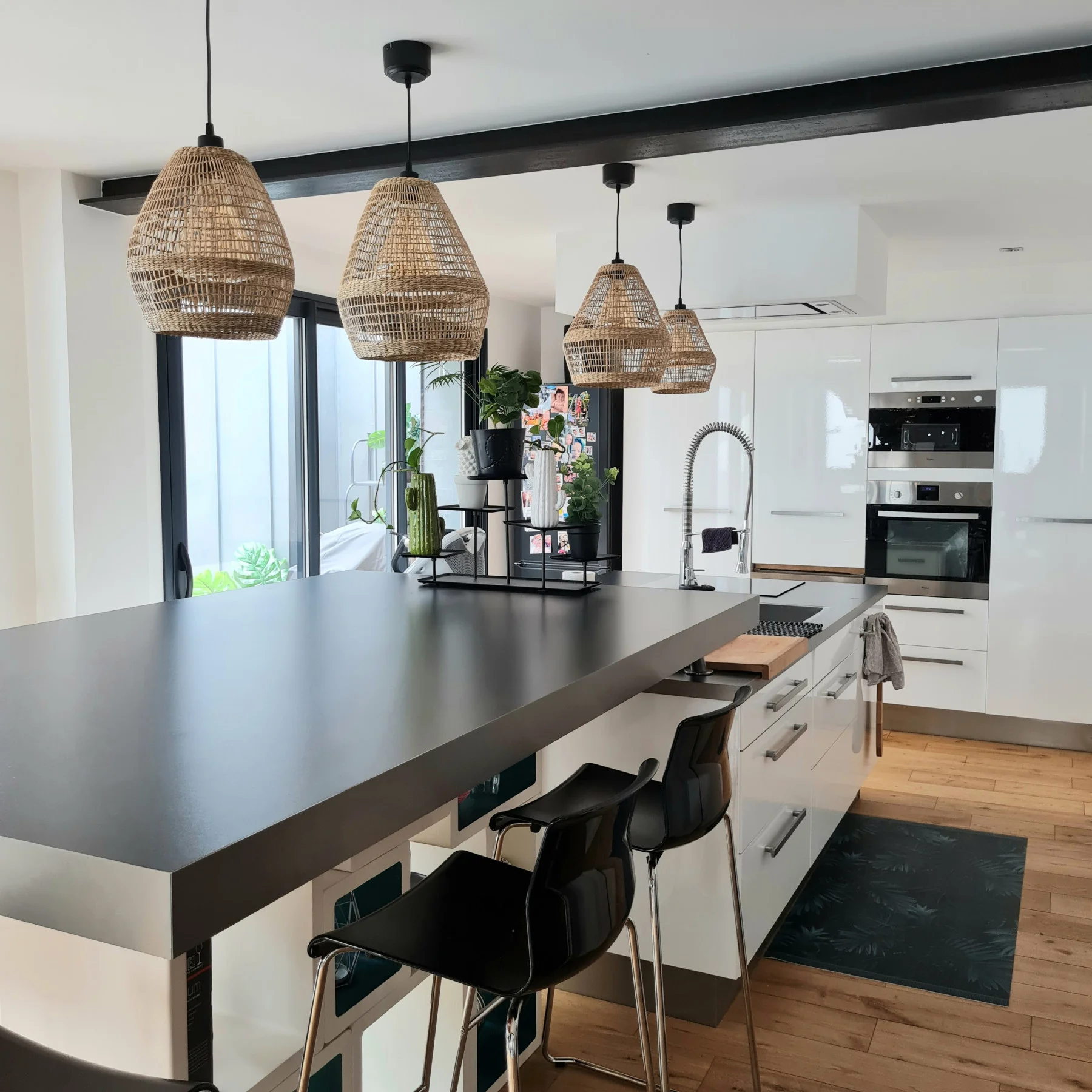 La cuisine, véritable cœur du loft, est un autre atout majeur de cette transformation. Très spacieuse, elle dispose d’un grand îlot central qui devient le lieu de convivialité par excellence. L’îlot, généreusement dimensionné, invite à la préparation des repas tout en facilitant les échanges entre les membres de la famille ou les invités.